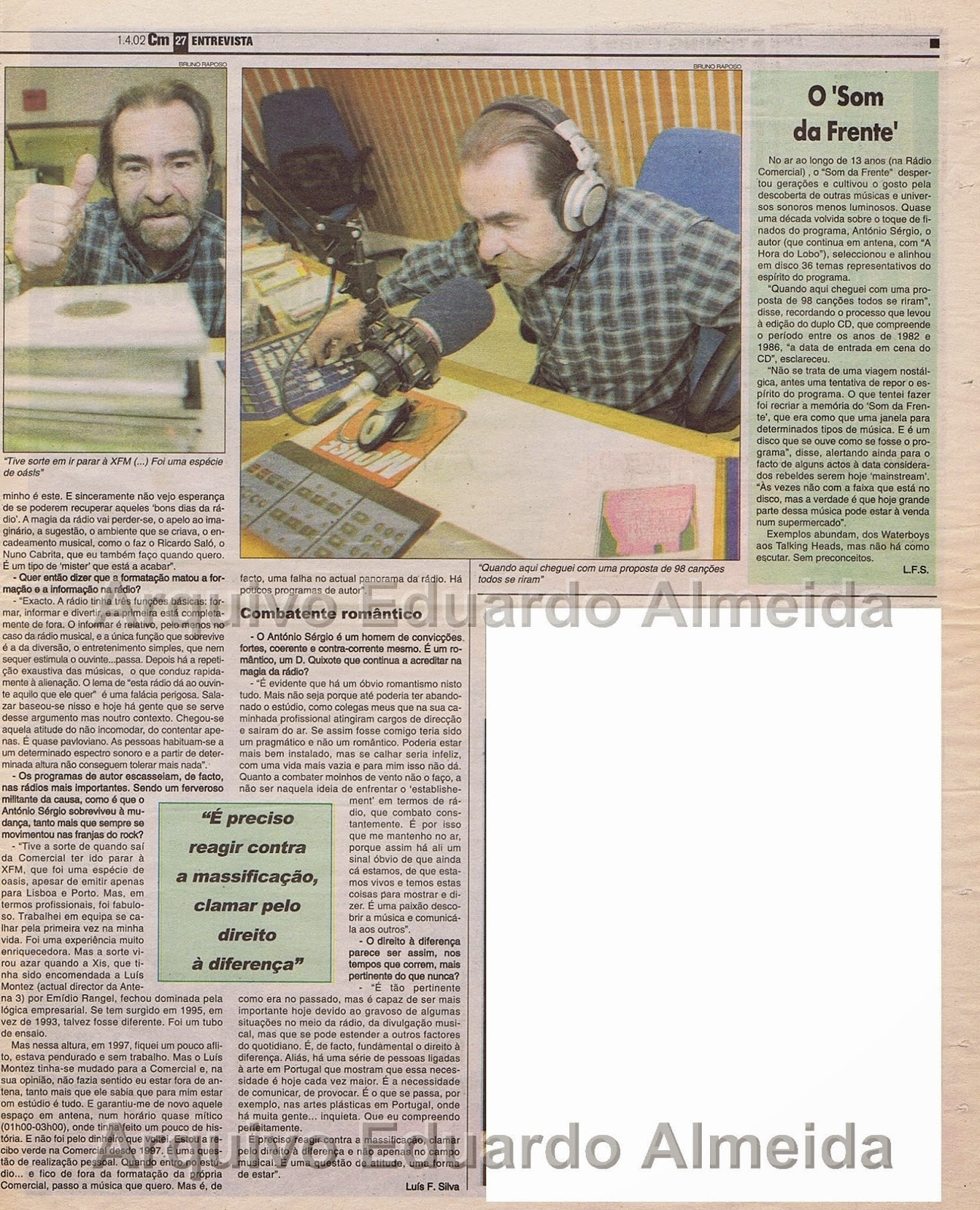 Reencontrei o António Sérgio quando a inesquecível XFM iniciou as suas emissões para a cidade do Porto, onde vivo. Nunca o trânsito caótico da minha cidade me pareceu tão suportável. Foram os tempos do Grande Delta, da possibilidade de ouvir o António Sérgio em horário diurno, e tomar contacto com outros radialistas que, claramente, se identificavam com uma forma de fazer rádio e de divulgar alternativas, diferentes formas de fazer rádio influenciadas, cada uma à sua maneira, pelos projectos do Mestre ao longo dos anos 80 na Rádio Comercial. A XFM terminou e, durante mais de dez anos, deixei de ouvir os programas do António Sérgio. Ocasionalmente, num regresso mais tardio a casa, acabava por ouvir e matar saudades. Mas raramente acontecia.